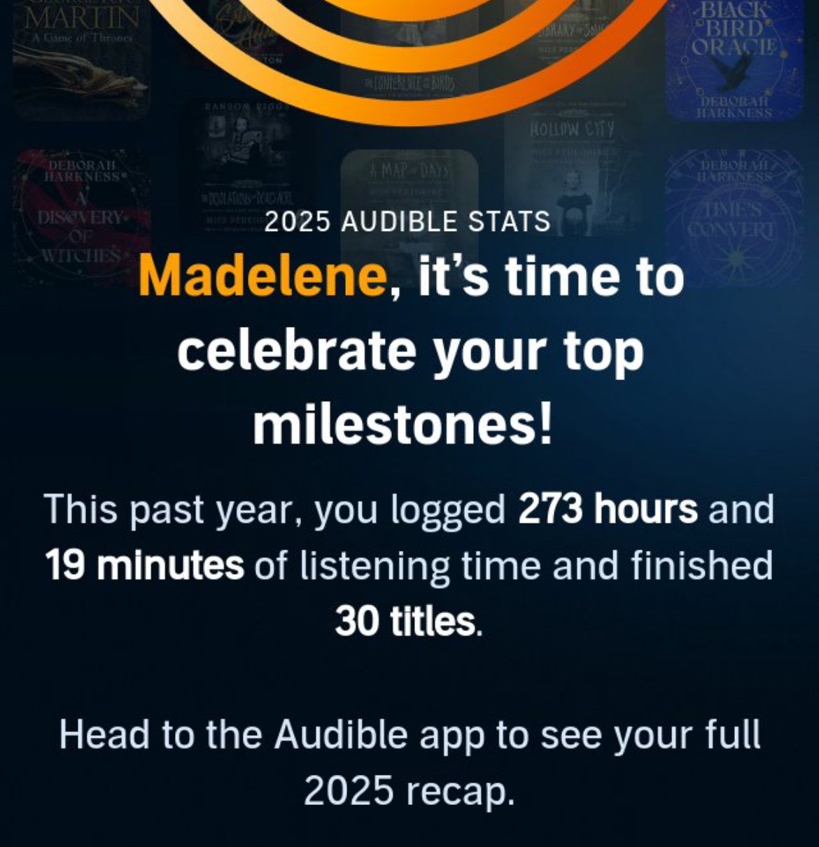 Jag har väntat i femton dagar på någon form av sammanställning från Audible. Inte för att det är avgörande, utan för att jag tycker om siffror när de bekräftar sådant jag redan vet. Idag kom den. Woho.